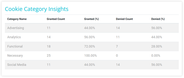 - Cookie Category Insights (Consent status for different cookie types) -- Shows which types of cookies (Necessary, Functional, Analytics, etc.) were accepted or denied.