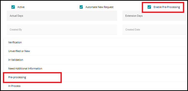 The user can now see a pre-process option under the 'Process Request' stage in the DSA Request screen. Now, all the action items configured for the selected flow's process phase will appear as the pre-process action items for the current request.