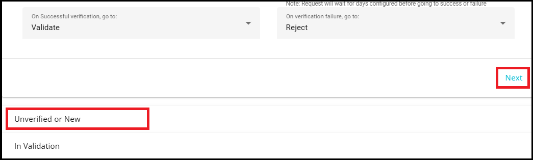 To access this section, use the Next option or click on the Unverified or New on the Flow screen. Here, the request is moved to the validation stage, or the user is sent a mail asking for additional information if needed.