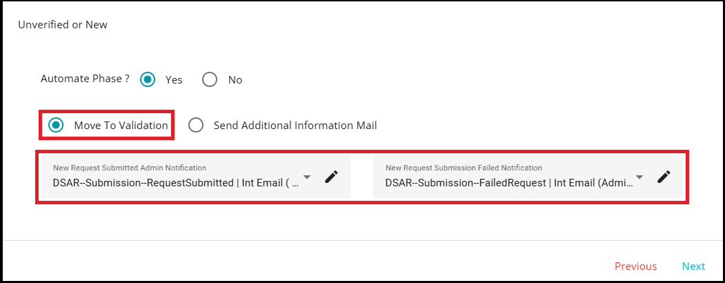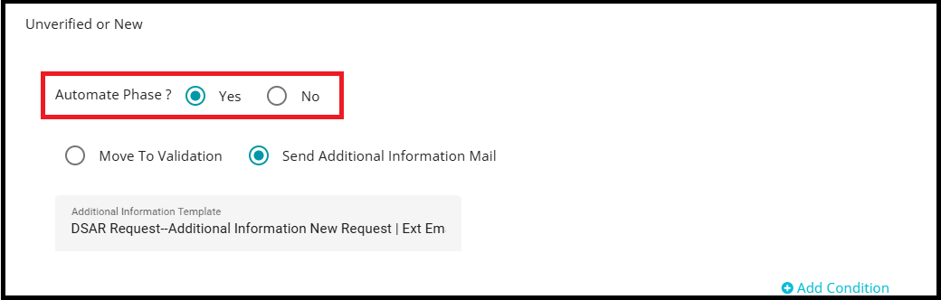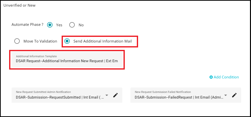- If the system determines that more details are needed from the requester to process the DSAR, you can configure the flow to automatically send an additional information email by selecting the Send Additional Information Mail option.