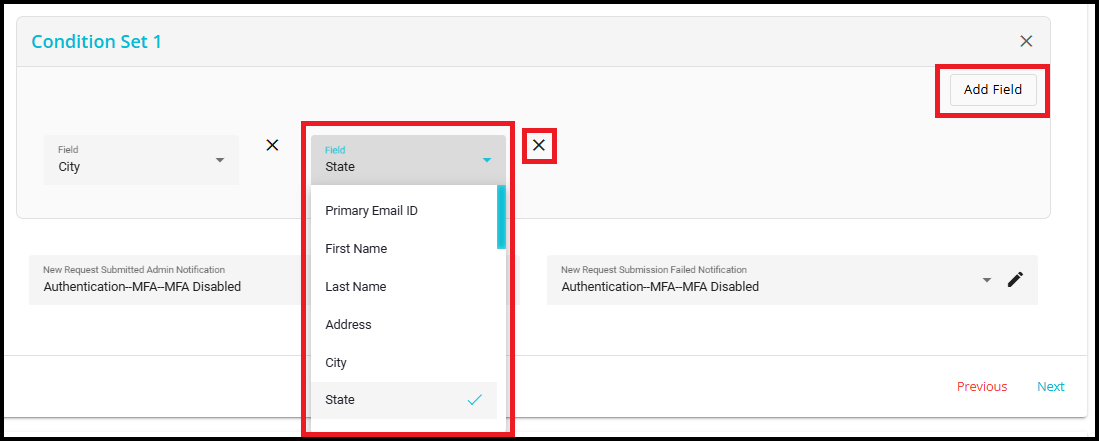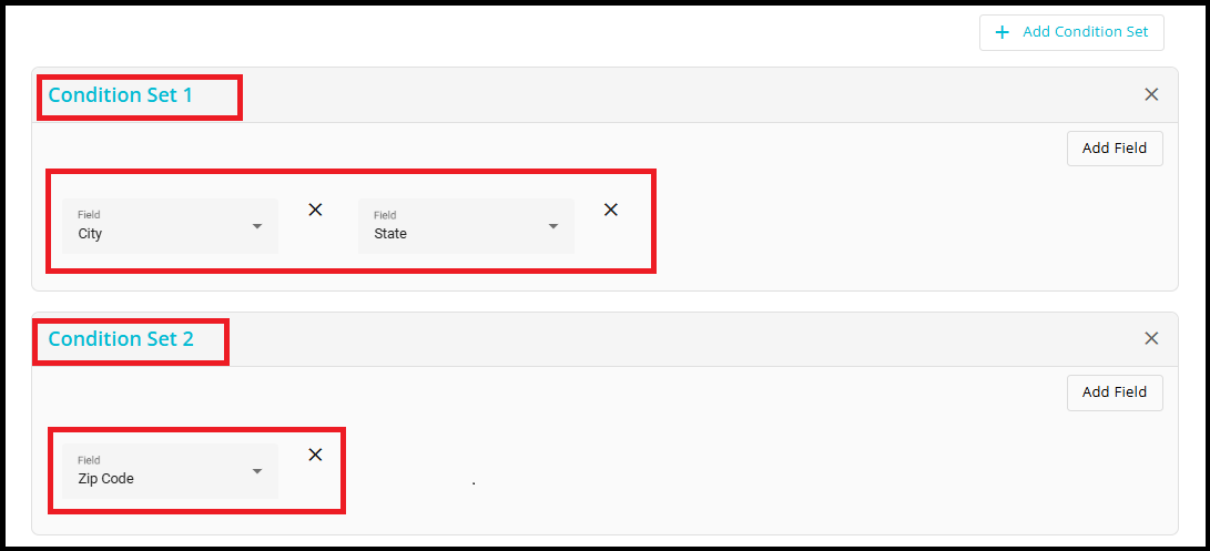 If you want to remove any field inside a Condition Set, simply click on the "X" icon located to the right side of that field.