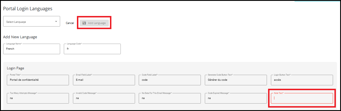 Note: The language code used while configuring the translation in Portal Login Languages must exactly match the language query parameter used in the Check Status / Privacy Portal login link.